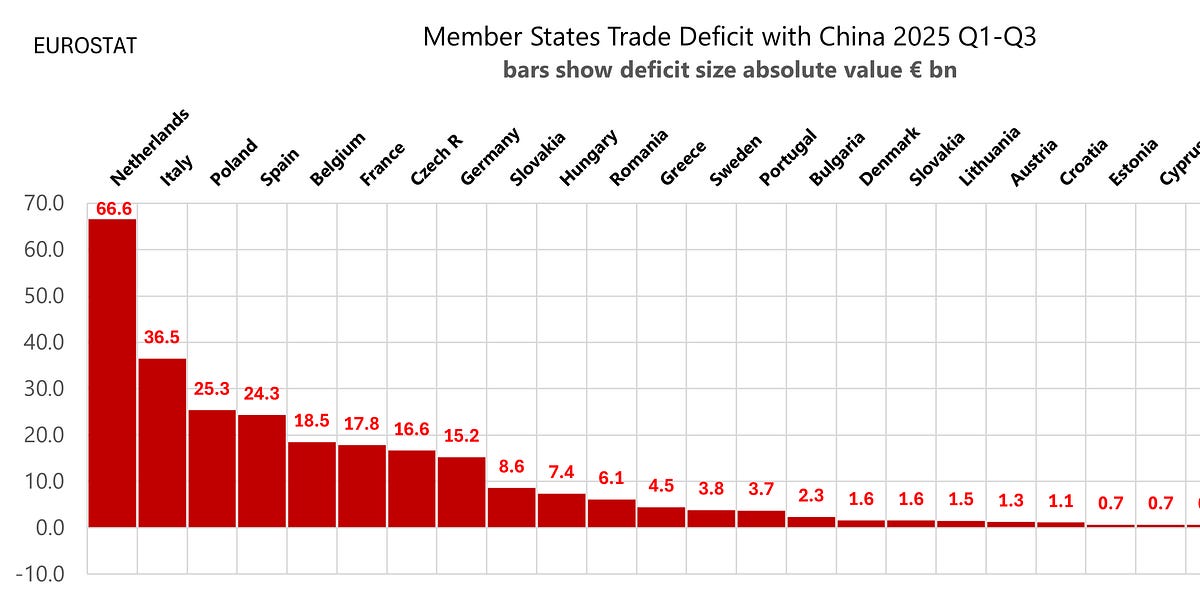 While Germany recorded a surplus of €59bn with the U.S. in the first three quarters of 2025, its deficit with China ballooned to €15.2bn from virtually zero a year earlier. Reducing such an unbalanced relationship to a story of ‘mutual trade’ is not just misleading, it is deliberate.