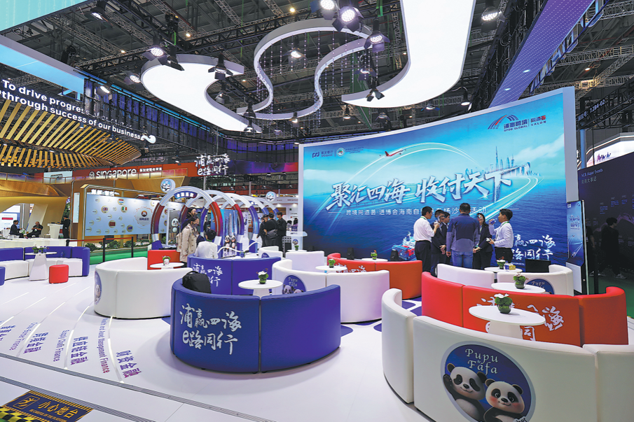 Visitors check the booth of Shanghai Pudong Development Bank at the eighth China International Import Expo in Shanghai on Nov 7. CHINA DAILY