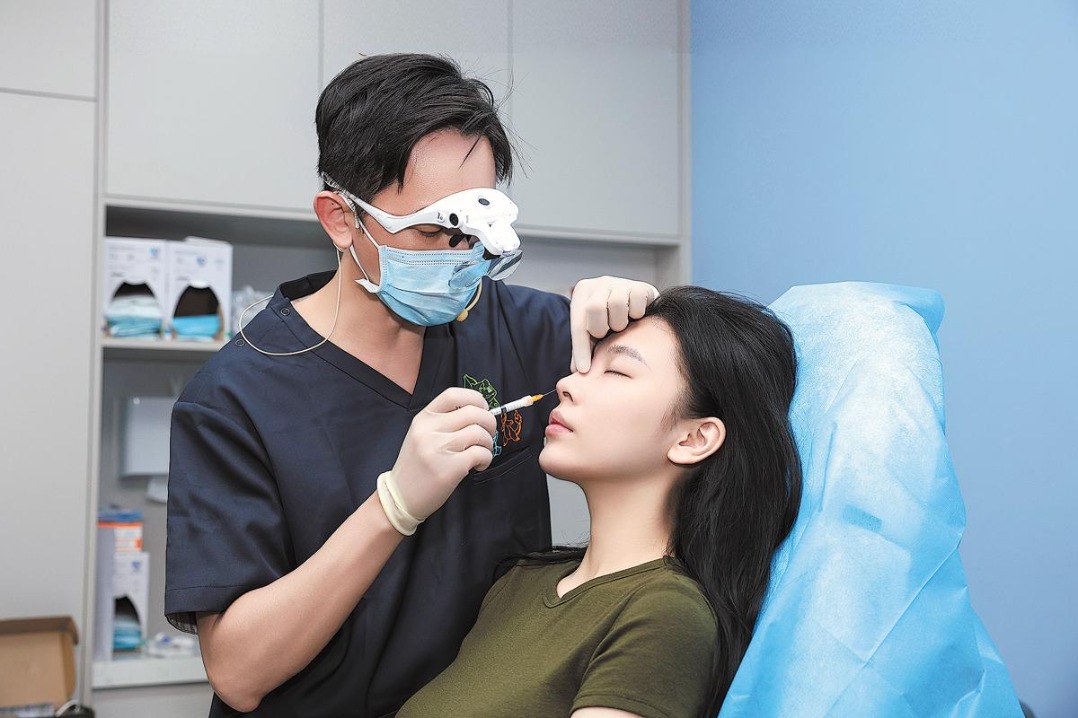 Wang Tso-Hsuan (left), CEO of Taiwan Nice Clinique and a veteran practitioner with 20 years of experience, administers an Ellanse dermal facial filler injection to shape his client’s nose. [Photo provided to CHINA DAILY]