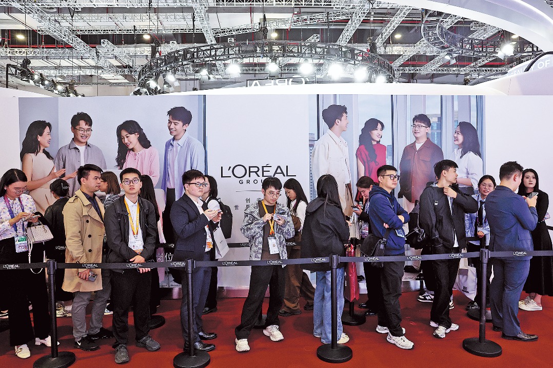 Visitors gather at L’Oreal’s booth during the eighth China International Import Expo in Shanghai on Wednesday. WANG JING/CHINA DAILY