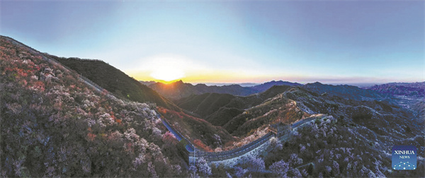 A panoramic drone photo taken in April 2025 shows the Mutianyu section of the Great Wall in Beijing at dawn. CHEN YEHUA/XINHUA