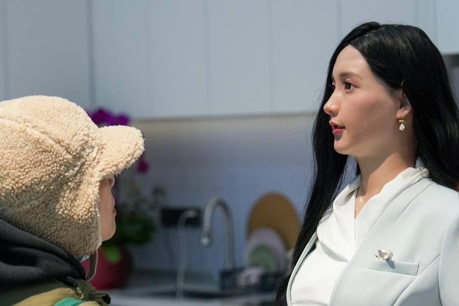 A visitor (L) looks at a humanoid robot from UBTECH at the Beijng World of Robots in Beijing, capital of China, Feb 24, 2025. [Photo/Xinhua]