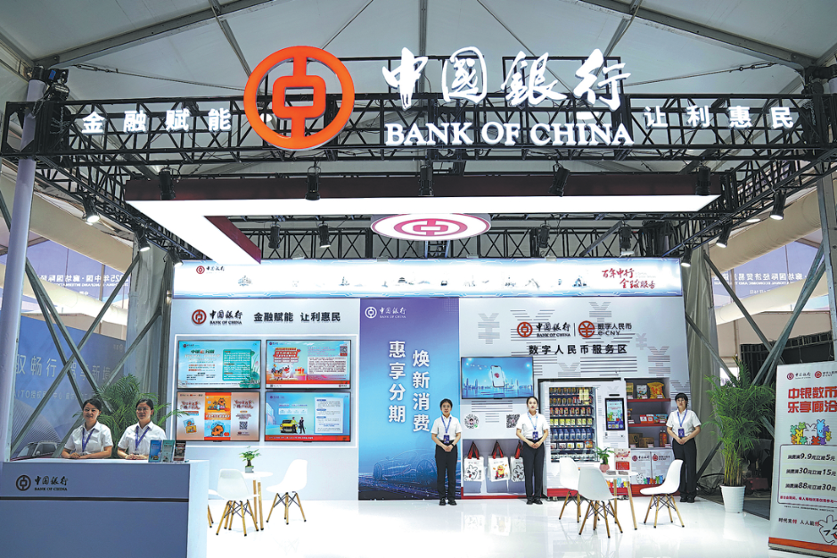 Clockwise from top: The booth of the Bank of China at the 2025 China Langfang International Economic and Trade Fair.A BOC staff member poses with a foreign visitor in front of the bank’s e-CNY product area at the fair. A woman is served at BOC’s payment service center in Shaanxi province. [Photos provided to China Daily]