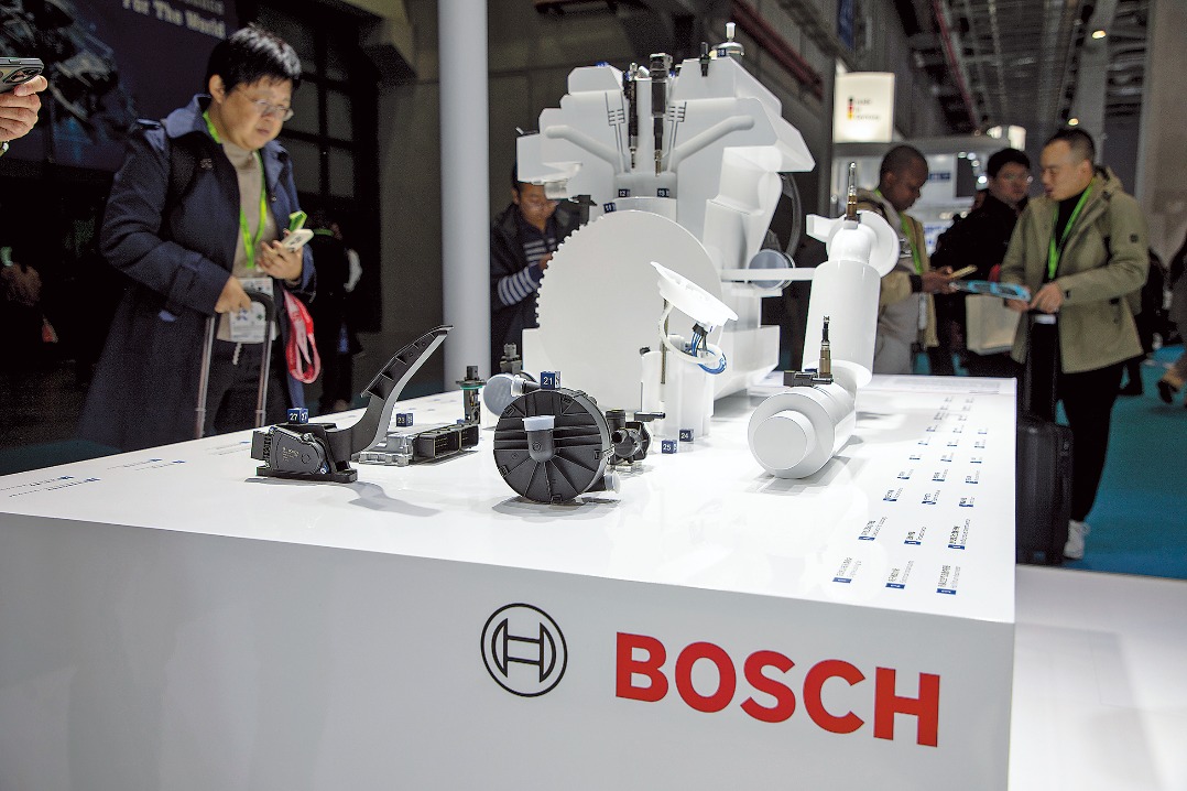 Bosch’s EV parts on display during an auto show in Shanghai. CHINA DAILY