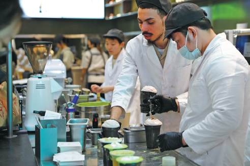 Workers of Heytea make beverages in New York on March 8. LIAO PAN/CHINA NEWS SERVICE