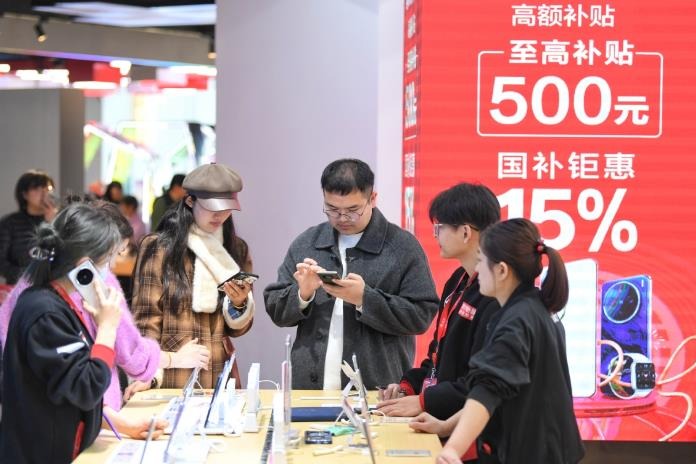 Shoppers browse digital products offering trade-in subsidies at a store in Hefei, Anhui province. CHEN SANHU/FOR CHINA DAILY