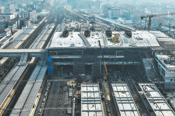An aerial drone photo shows construction at Liupanshui Railway Station in Liupanshui, Guizhou province, on Dec 11. TAO LIANG/XINHUA