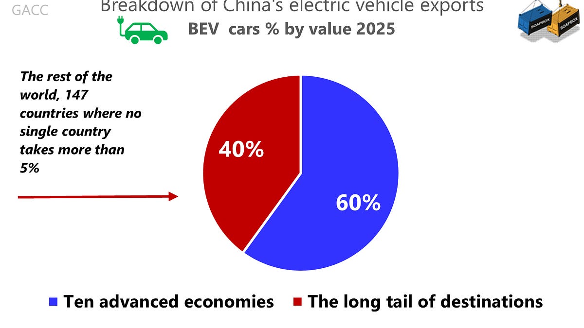 For this note, we split China’s BEV export destinations into two groups: ten advanced economies (about 60% of export value) and the long tail of destinations (the other 147 markets, together 40%, with no single market above 5%).