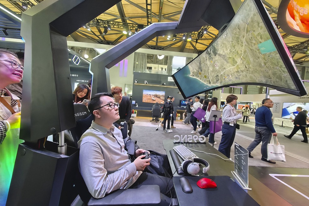A visitor experiences a set of gaming gear, made up of a gaming chair and a monitor at the Appliance and Electrics World Expo held in Shanghai, on March 20, 2025. [Photo/VCG]