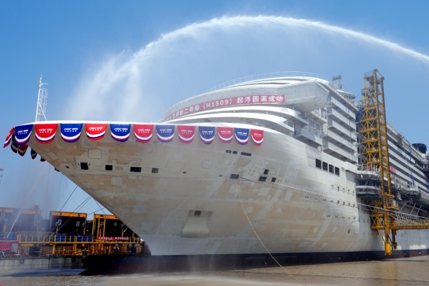 China’s second domestically built large cruise ship, Adora Flora City, receives a water salute on Monday at Shanghai Waigaoqiao Shipbuilding as the vessel achieves the milestone of dock float-up. This marked its transition from structural outfitting to interior installation and system commissioning. [GAO ERQIANG/CHINA DAILY]