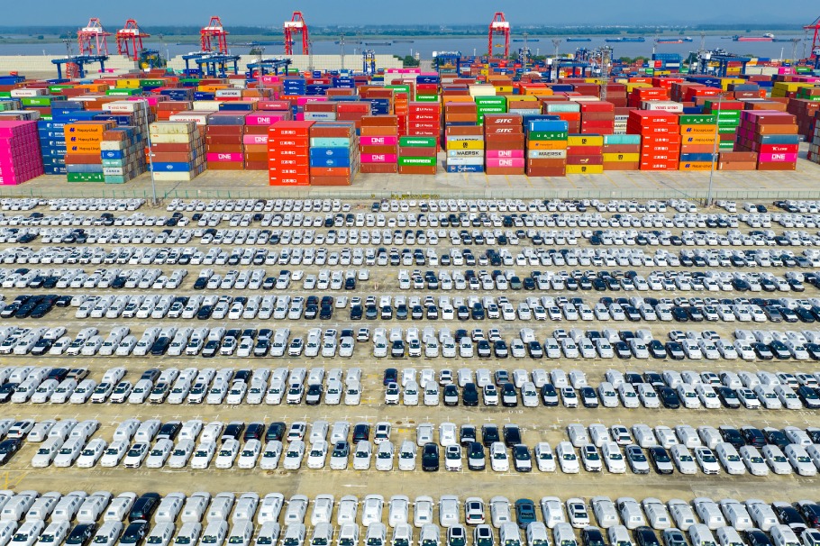 An aerial drone photo taken on Oct 4, 2025 shows cars ready for shipment and export at a port area in Nanjing, East China’s Jiangsu province. [Photo/Xinhua]