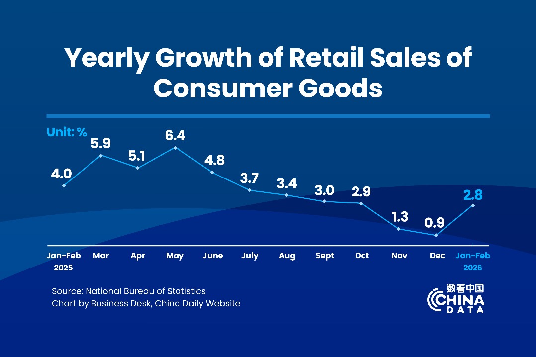 BEIJING — China’s retail sales of consumer goods went up 2.8 percent year-on-year in the first two months of 2026, data from the National Bureau of Statistics (NBS) showed Monday.