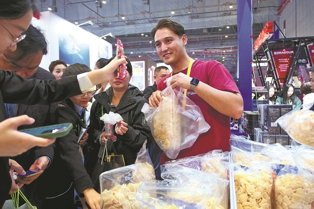 A Russian vendor introduces roasted shrimp chips, milk powder and other Russian specialties to visitors at the food and agricultural products exhibition area during the 7th China International Import Expo in Shanghai on Nov 7, 2024. TIAN JIASHUO/FOR CHINA DAILY