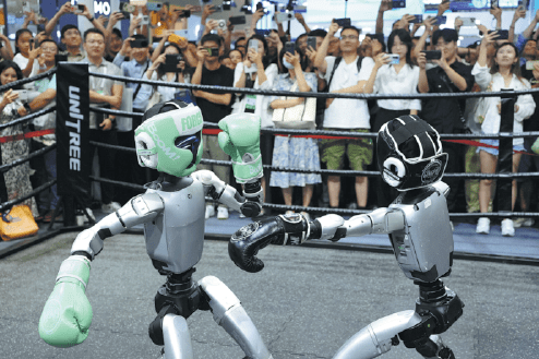 A robot boxing competition held by Unitree Robotics captivates visitors during the 2025 World AI Conference in Shanghai. GAO ERQIANG/CHINA DAILY