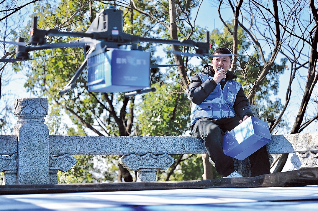 A courier operates a drone to deliver food in Hangzhou, Zhejiang province, on Jan 14. XU YAN/FOR CHINA DAILY