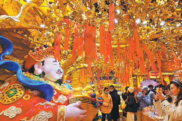 Revelers take photos of the God of Wealth at Huaxi Live in Haidian district, Beijing, on Dec 31. GENG FEIFEI/CHINA DAILY