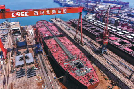 A drone image shows a CSSC shipbuilding site at a yard in Qingdao, Shandong province, in May. YU FANGPING/FOR CHINA DAILY