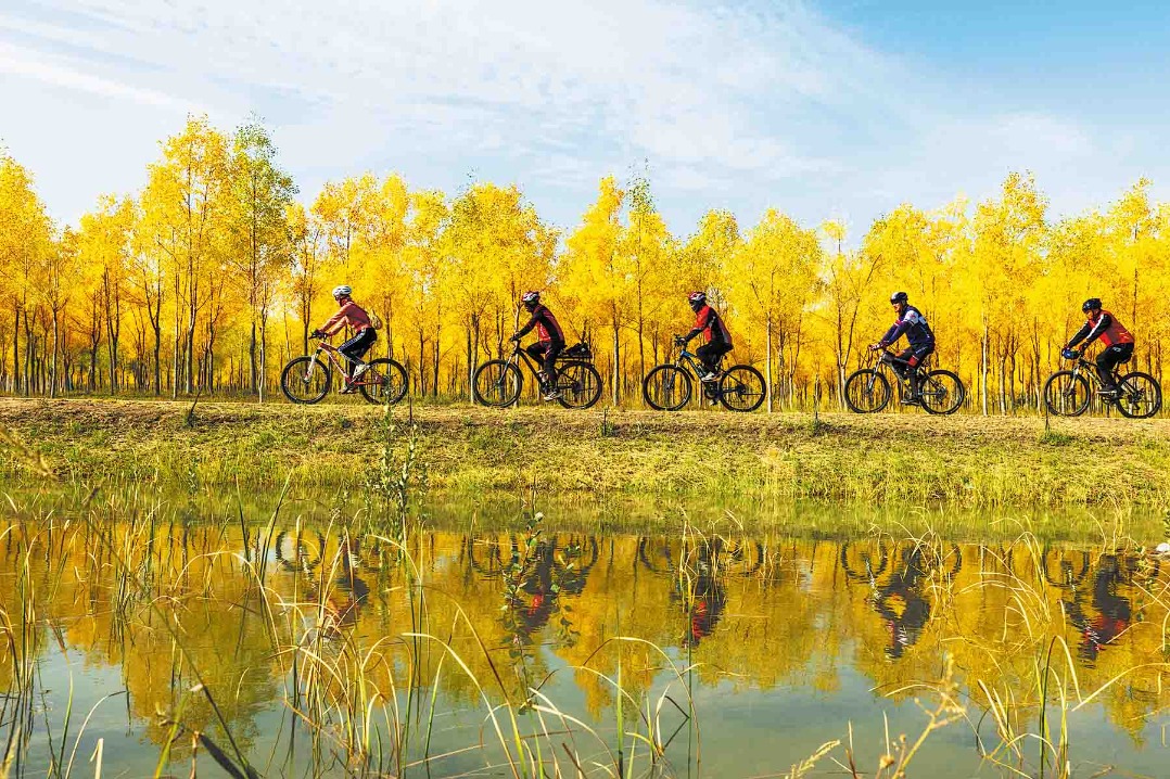 People cycle through a forest of poplar trees at a park in Zhangye, Gansu province, on Sept 27. YANG XIAO/FOR CHINA DAILY