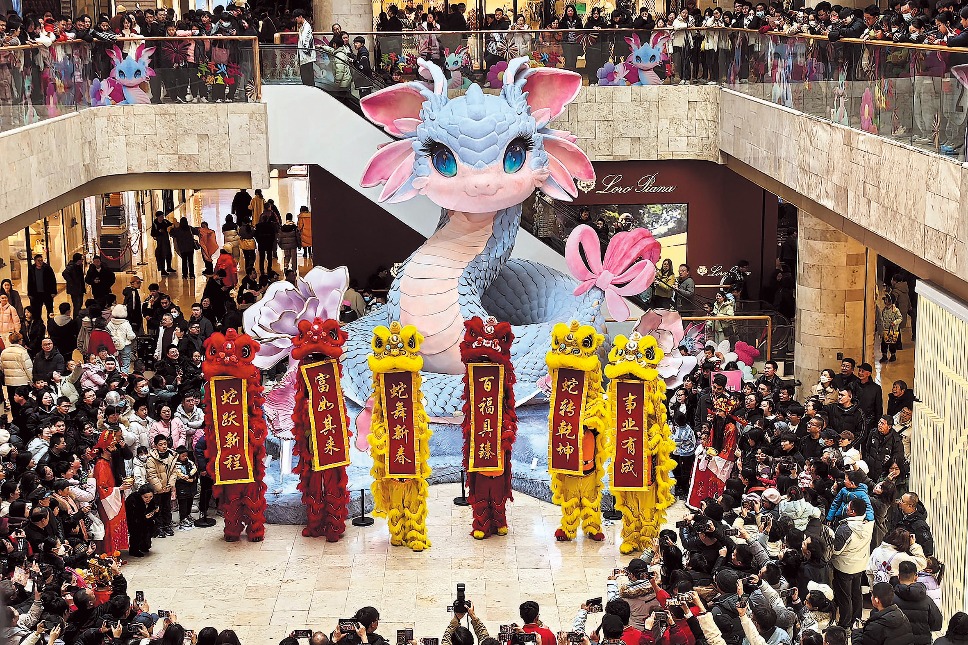 People watch a lion dance performance at Nanjing Deji Plaza on Feb 2. CHINA DAILY