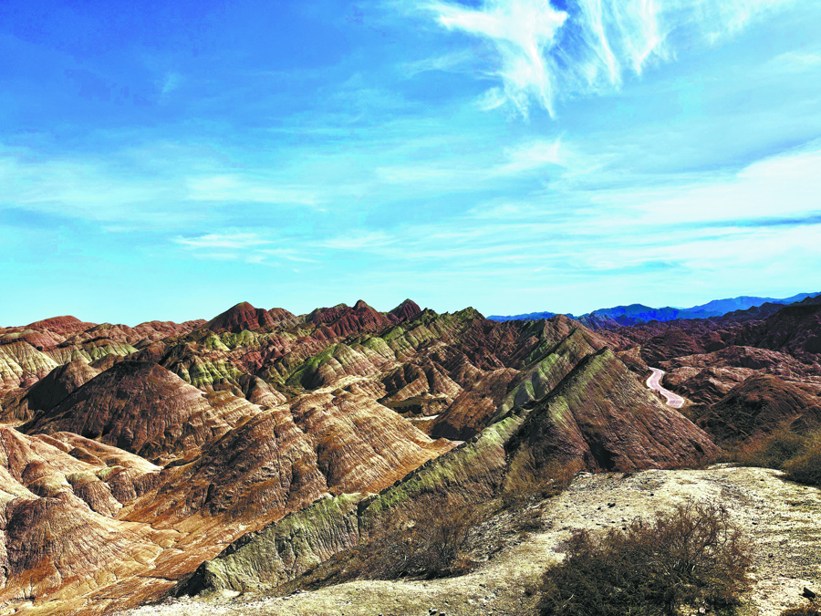 Take a side trip by rail from Dunhuang to view the “Rainbow Mountains” at the Zhangye Danxia National Geopark from viewing platform. [Photo by Kara Schroeder/China Daily]