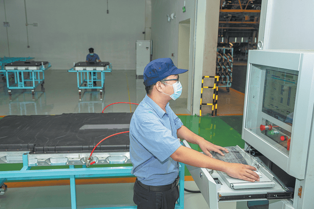 A worker inspects the batteries of pure electric vehicles at the production workshop of Haima Automobile’s base in Haikou, Hainan province, in October 2022. YUAN CHEN/FOR CHINA DAILY