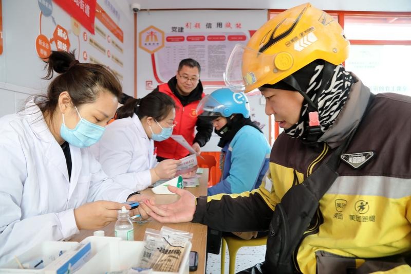 Volunteers provide free blood sugar measurements in Shizhong district, Zaozhuang, Shandong province, on March 5, 2025. [Photo/Xinhua]