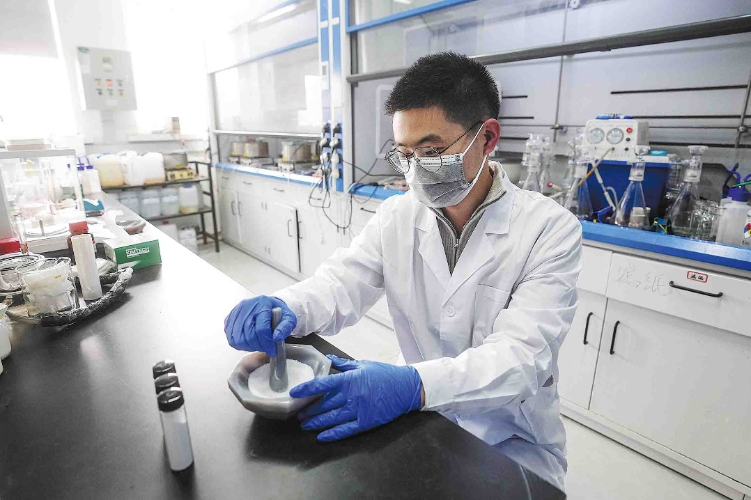A researcher grinds a modified semiconductor photocatalytic material in Shenyang, Liaoning province, on April 7. PAN YULONG/XINHUA