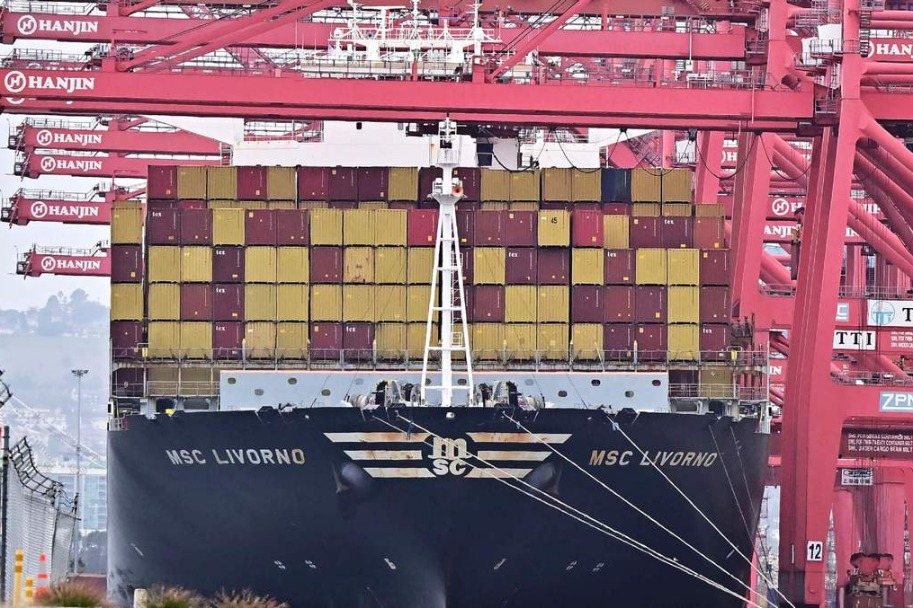 Shipping containers on the MSC Livorno await unloading at the Port of Long Beach, California on March 5, 2025. [Photo/Agencies]