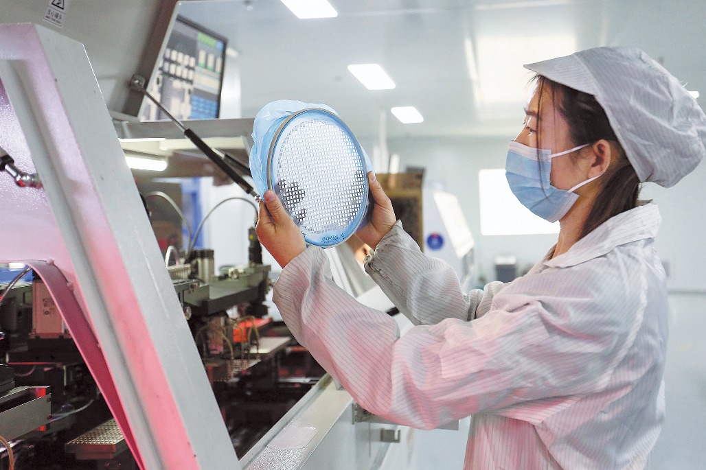 A technician inspects semiconductor chip packaging in Binzhou, Shandong province, on Jan 28. GUO ZHIHUA/FOR CHINA DAILY