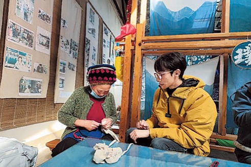 Zerin Moirangthem (right) learns traditional tie-dye techniques at a workshop in Dali, Yunnan province. [Photo provided to China Daily]