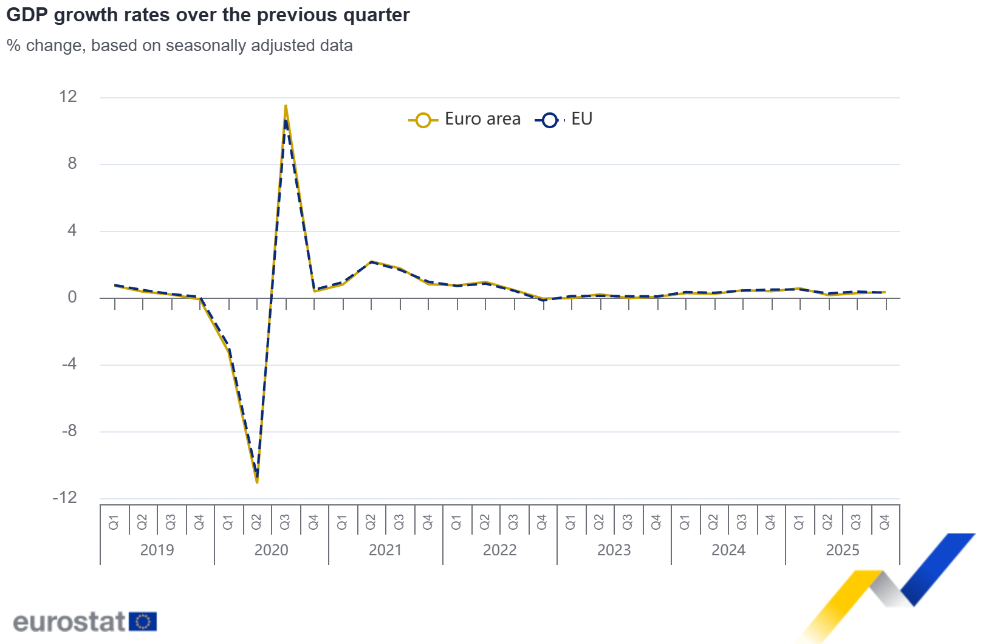 []In the fourth quarter of 2025, seasonally adjusted GDP increased by 0.3% in both the euro area and the EU, compared with the previous quarter, according to a preliminary flash estimate published by Eurostat, the statistical office of the European Union. In the third quarter of 2025, GDP had increased by 0.3% in the euro area and by 0.4% in the EU.