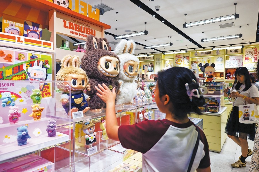 Consumers check out toys at a Pop Mart store in Shanghai on July 24. CHINA DAILY
