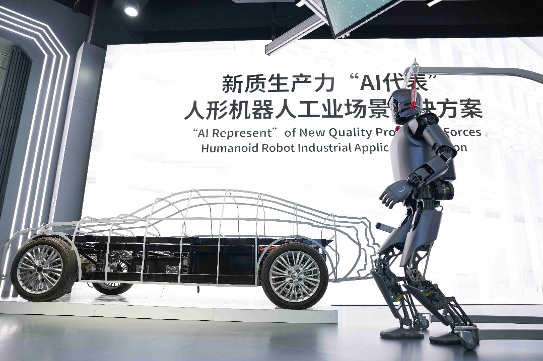 A humanoid robot industrial application solution is demonstrated during a recent industry expo in Beijing. [Photo/Xinhua]