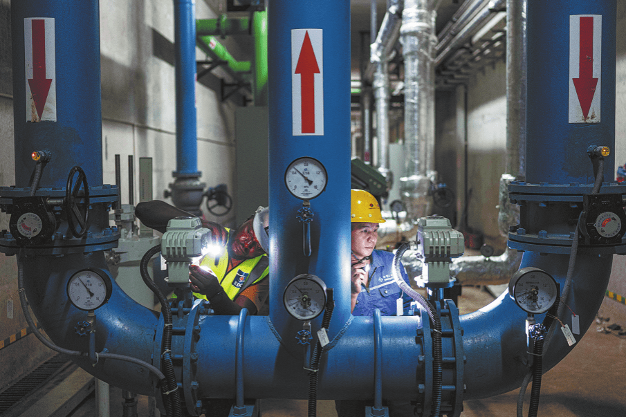 Engineers check a Chinese-built hydropower station in Cameroon. WANG GUANSEN/XINHUA