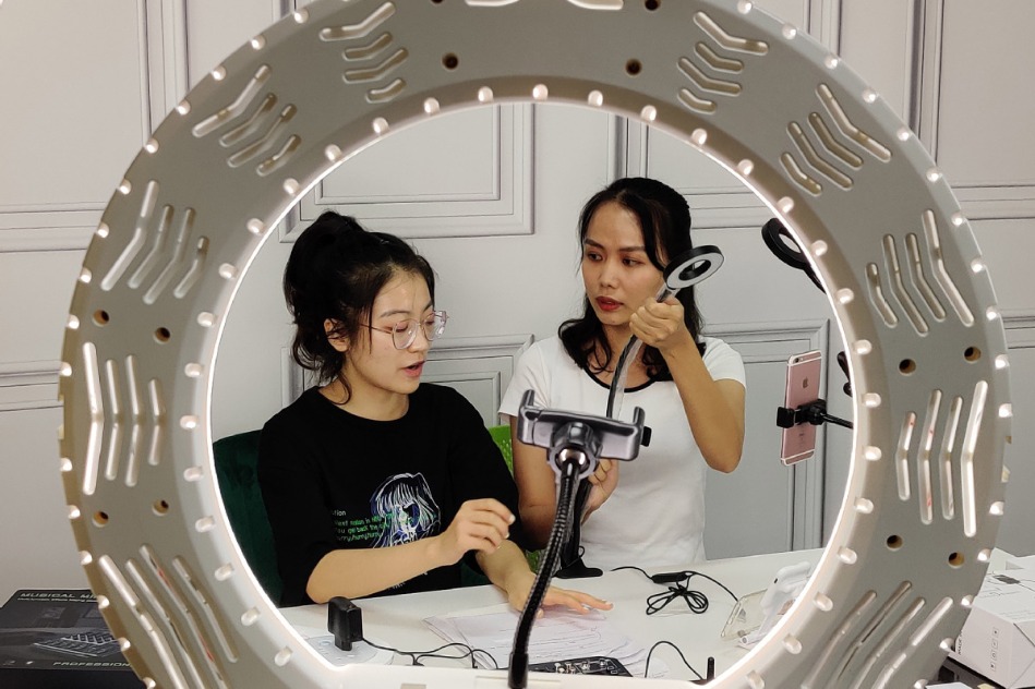 An international student from Vietnam (right) helps deliver an e-commerce livestreaming session in the Nanning Area of the China (Guangxi) Pilot Free Trade Zone. [Photo/Xinhua]
