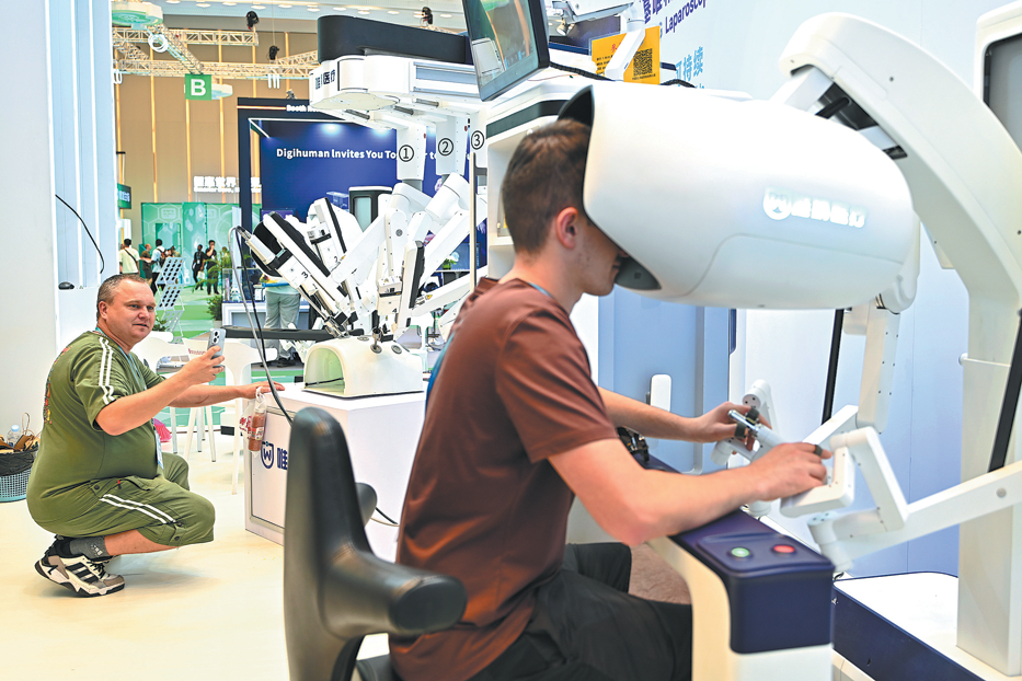 A buyer tries out a medical treatment robot at the ongoing Canton Fair in Guangzhou, Guangdong province. CHEN JIMIN/CHINA NEWS SERVICE