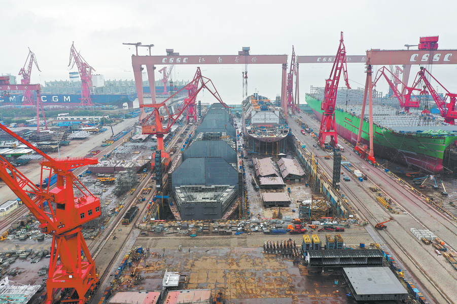 An image captures a vessel being built at a shipyard of Hudong-Zhonghua Shipbuilding (Group) Co Ltd in Shanghai. SHEN CHUNCHEN/FOR CHINA DAILY