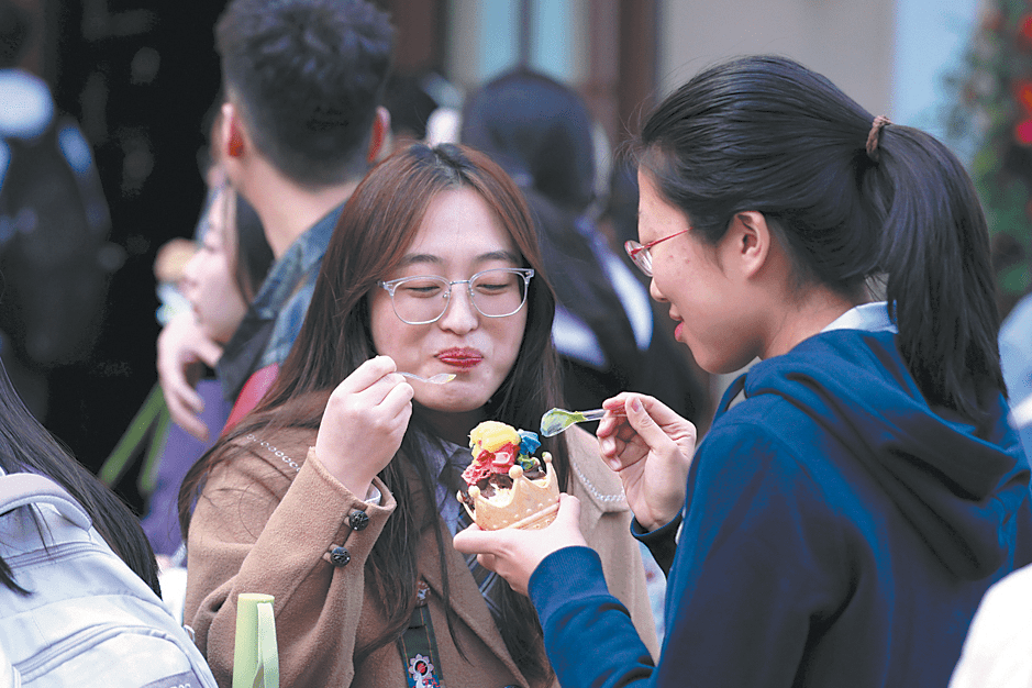 Tourists share and taste ice cream at the Baroque-style historical and cultural district of Harbin, Heilongjiang province, on May 4. CHINA DAILY