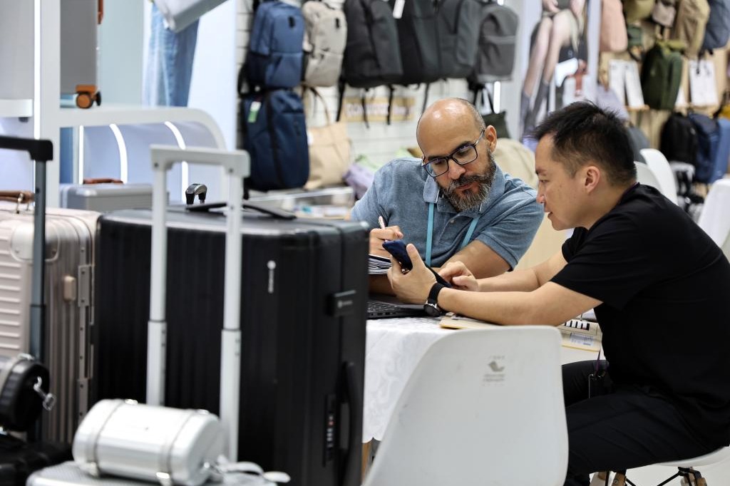 A purchaser talks with an exhibitor at a baggage booth at the 137th China Import and Export Fair in Guangzhou, South China’s Guangdong province, May 5, 2025. [Photo/Xinhua]