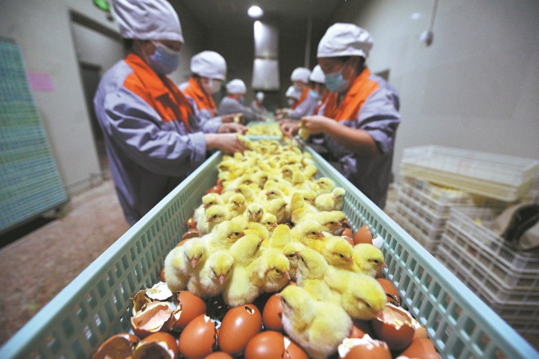 Staff select laying hens from chicks at Beijing Huadu Yukou Poultry Industry Co Ltd in Pinggu district, Beijing, on April 12. WEI TONG/FOR CHINA DAILY
