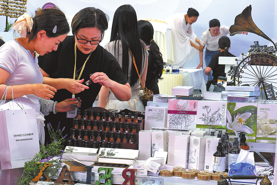 A visitor (left) browses cosmetics during the 67th China International Beauty Expo at the National Exhibition and Convention Center in Shanghai on June 25. [Photo provided to China Daily]