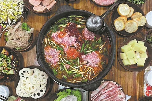 Tourists enjoy the local stewed pot dishes and performance at the Yingchun street of Guangde, Anhui province. [Photo provided to China Daily]