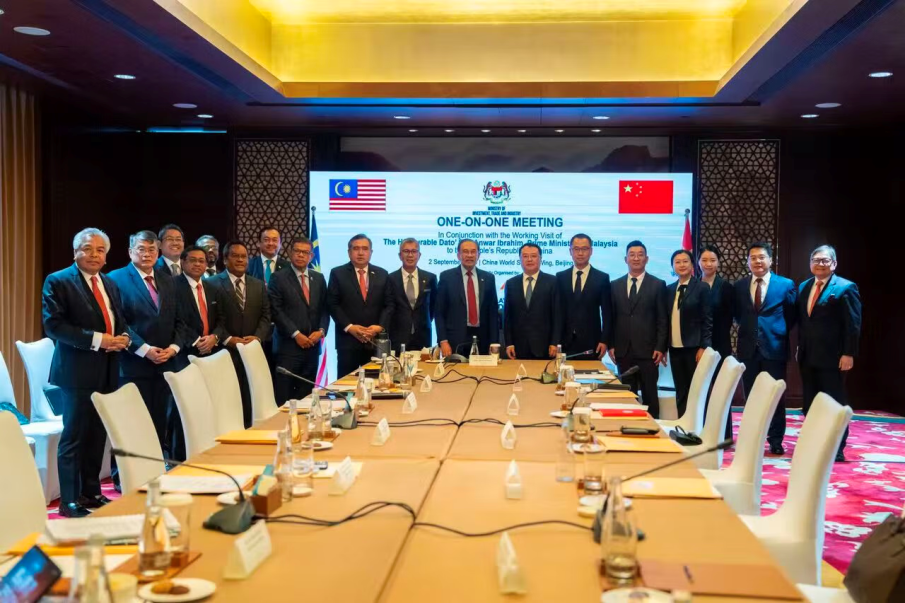 Malaysian Prime Minister Anwar Ibrahim with senior members of JD Logistics. [Photo provided to chinadaily.com.cn]