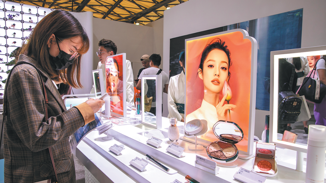 A visitor checks products from Chinese cosmetics brand Florasis during the 27th China Beauty Expo on May 12 in Shanghai. CHINA DAILY