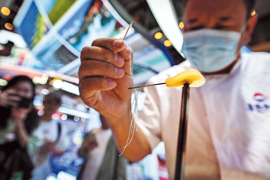 A cook demonstrates threading noodles through the eye of a needle at the third Innovation Exchange Conference for Craftsmen of the Nation in Chongqing on Tuesday. LONG FAN/FOR CHINA DAILY