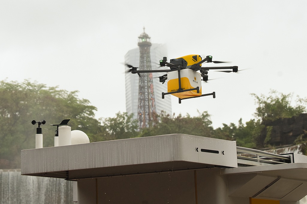 A drone lands at Meituan’s food delivery service point at a scenic spot in Shenzhen, April 5, 2025. [Photo/VCG]