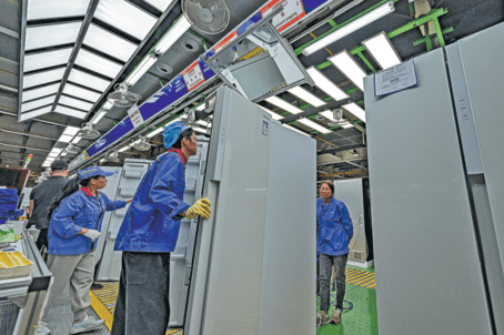 Midea employees work at a refrigerator production facility in Jingzhou, Hubei province, on July 14. LIU SHUSONG/FOR CHINA DAILY