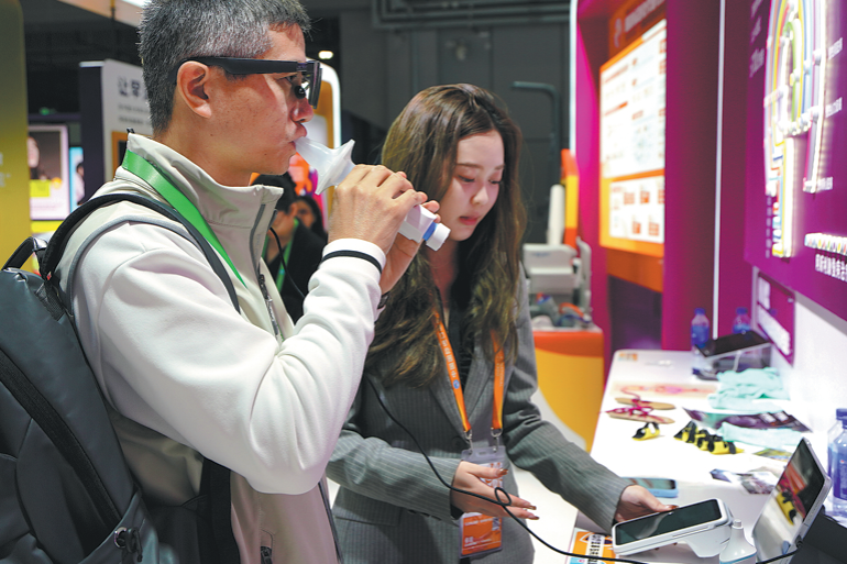 A visitor experiences a pulmonary function tester at AstraZeneca’s booth during the eighth China International Import Expo in Shanghai on Friday. FAN YUQING/XINHUA