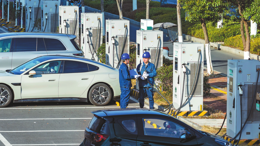 State Grid technicians check EV charging facilities in Wuhu, Anhui province, on Dec 28. XIAO BENXIANG/FOR CHINA DAILY
