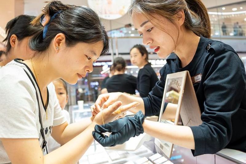 A customer (L) tries gold jewelry at a shopping mall in Nantong, East China’s Jiangsu province, May 3, 2025. [Photo/Xinhua]
